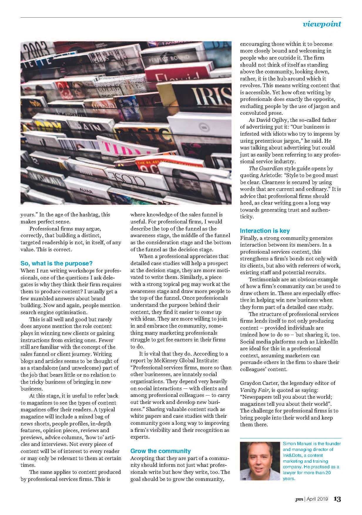 Think more like magazines – article in PM Magazine Content 1 Nov Written By Simon Manuel Simon Manuel